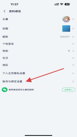 3、在资料修改界面,向下滑动找到并点击账号与绑定设置。