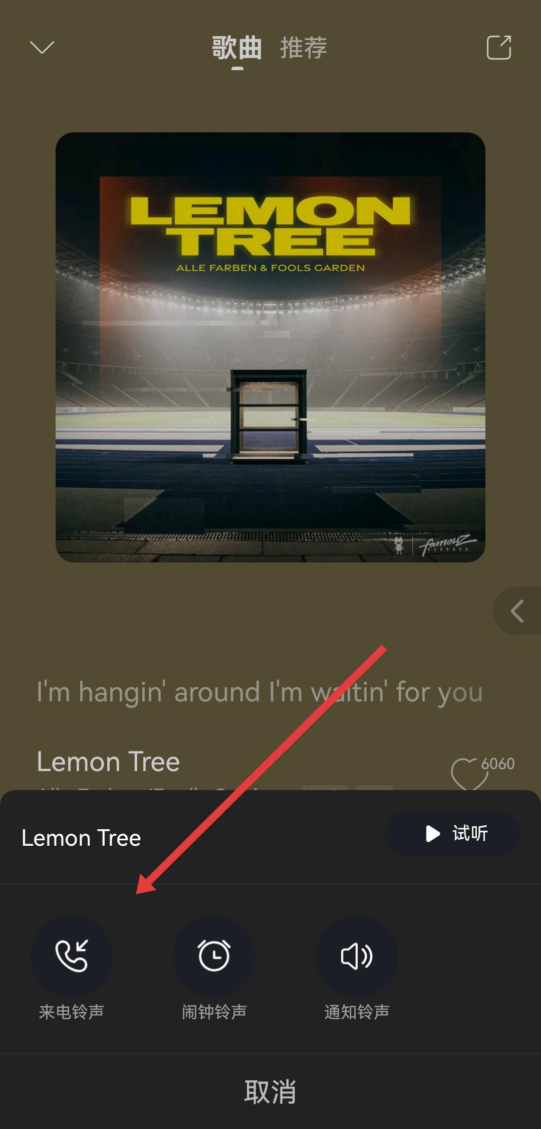 3、在弹出的选项中,点击来电铃声,即可将该歌曲设置为手机的来电铃声。