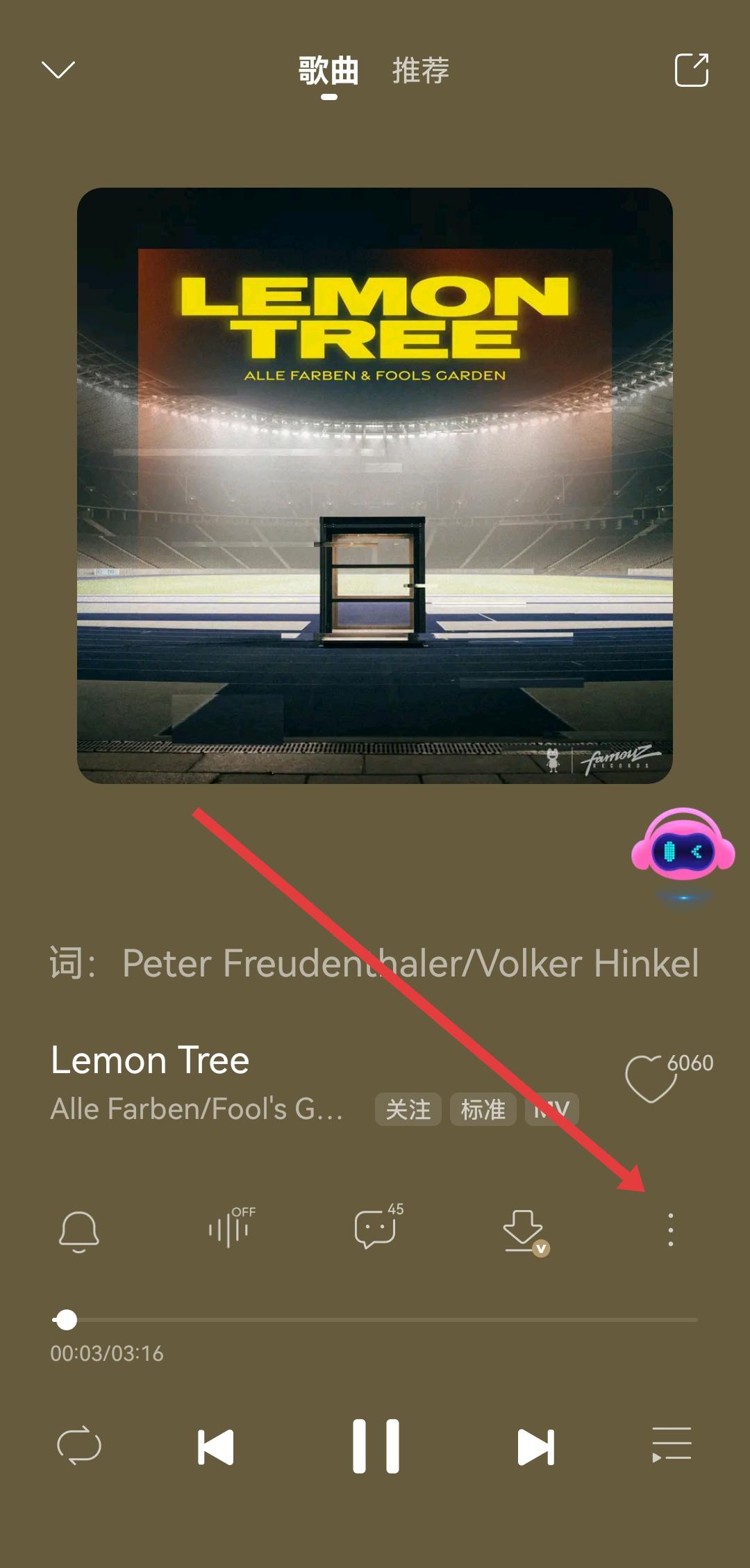 1、找到想要设置为来电铃声的歌曲,进入歌曲播放界面后,点击界面右侧的三个点图标,调出功能菜单。