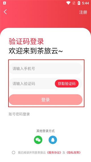 4、进入登录页面后,找到手机号输入框,输入对应的手机号码,再点击获取验证码按钮等待填入。