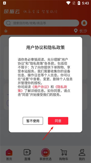 1、打开软件后,查看弹出的用户协议和隐私政策提示,点击同意按钮,完成该提示的确认操作。