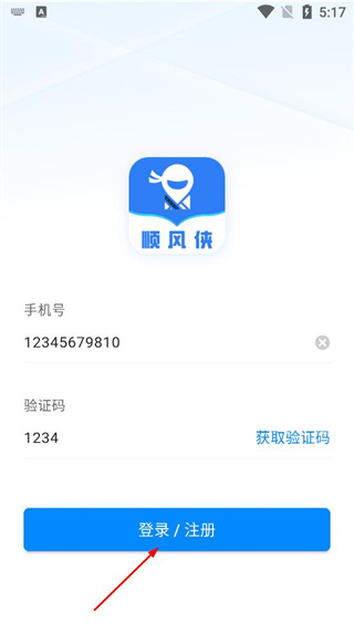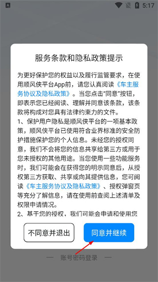 1、打开顺风侠App后,查看服务条款和隐私政策提示,点击同意并继续按钮,完成该提示的确认操作。