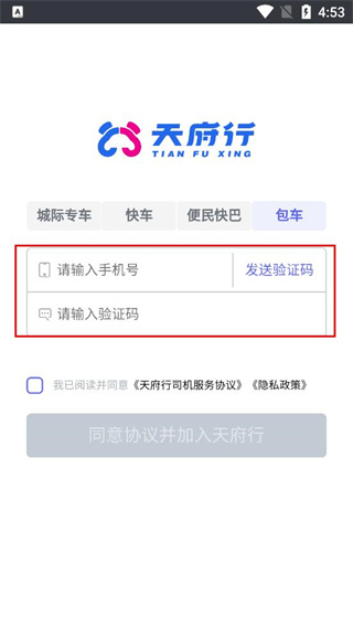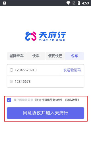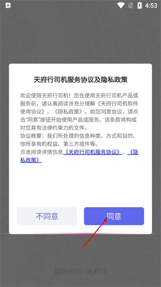 1、打开天府行,弹出司机服务协议及隐私政策弹窗,阅读后点击同意按钮,完成协议确认。