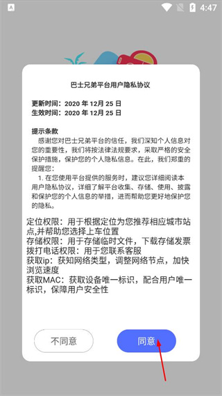 1、打开巴士兄弟,弹出平台用户隐私协议弹窗,阅读后点击同意按钮,完成协议确认。