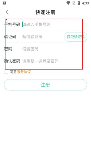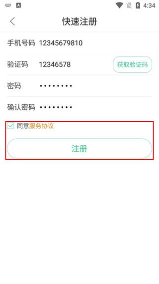 3、勾选同意服务协议选项,确认所有信息填写无误后,点击注册按钮完成注册操作。