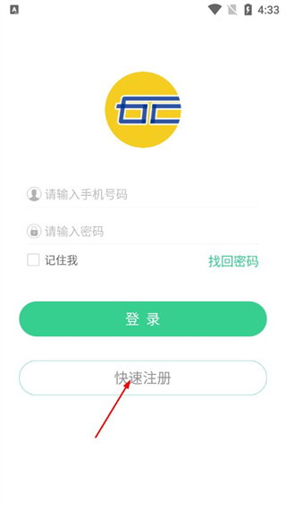 1、进入该软件登录页面,找到快速注册按钮,点击该按钮进入快速注册界面。
