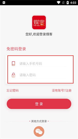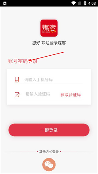 1、打开煤客软件,进入登录页面后找到账号密码登录选项,点击该选项。
