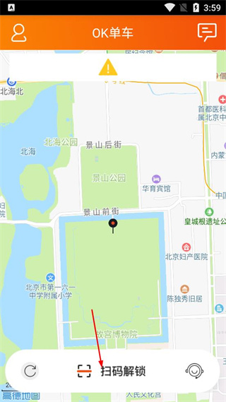 4、登录完成返回主界面,找到页面底部的扫码解锁按钮,点击该按钮准备解锁车辆。