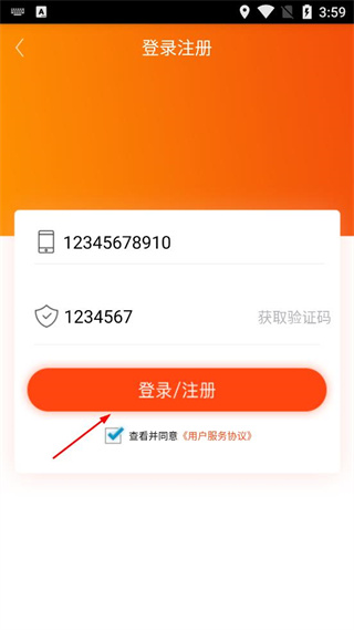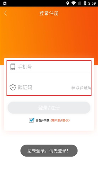 3、在手机号输入框填写号码,获取并填写验证码,勾选用户服务协议后点击登录/注册。