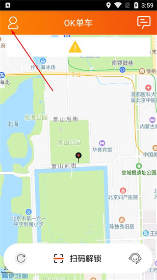 1、打开OK单车软件,进入主界面后找到左上角的个人图标,点击该图标。
