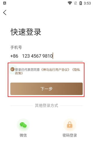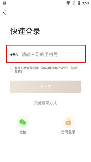 3、在快速登录页面的输入框中,填写对应的手机号码信息准备进行登录操作。