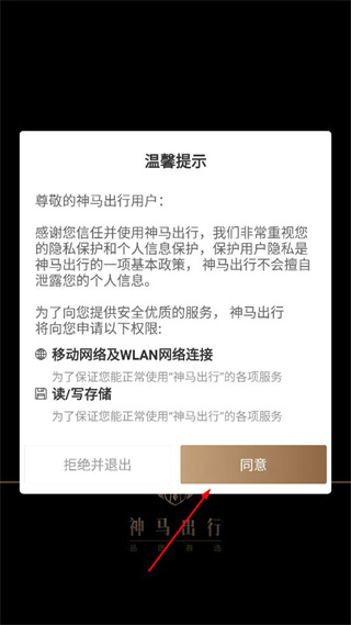 1、打开神马出行软件,弹出温馨提示权限申请弹窗,点击弹窗中的同意按钮。