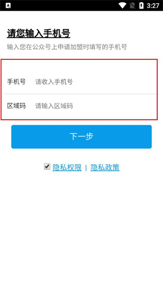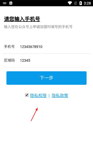 3、在手机号输入框填写对应号码,在区域码输入框填写对应编码,勾选隐私权限后点击下一步。