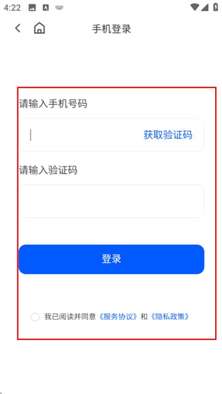 3、在手机登录页面,填写信息勾选协议后点击登录按钮,完成账号登录。