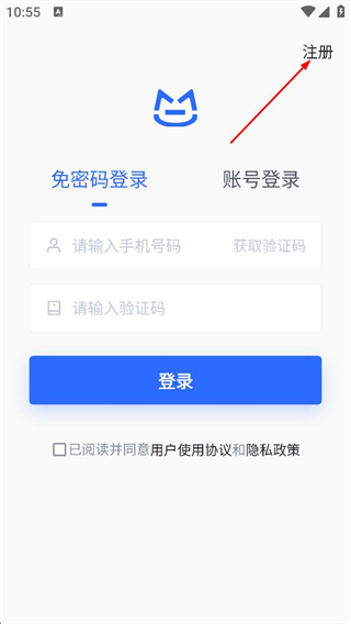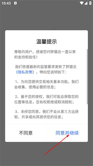 1、在胖猫云的温馨提示弹窗中,点击同意,进入登录相关页面。