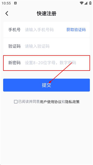 4、在快速注册页面,设置符合要求的密码,点击提交按钮,完成胖猫云的账号注册。