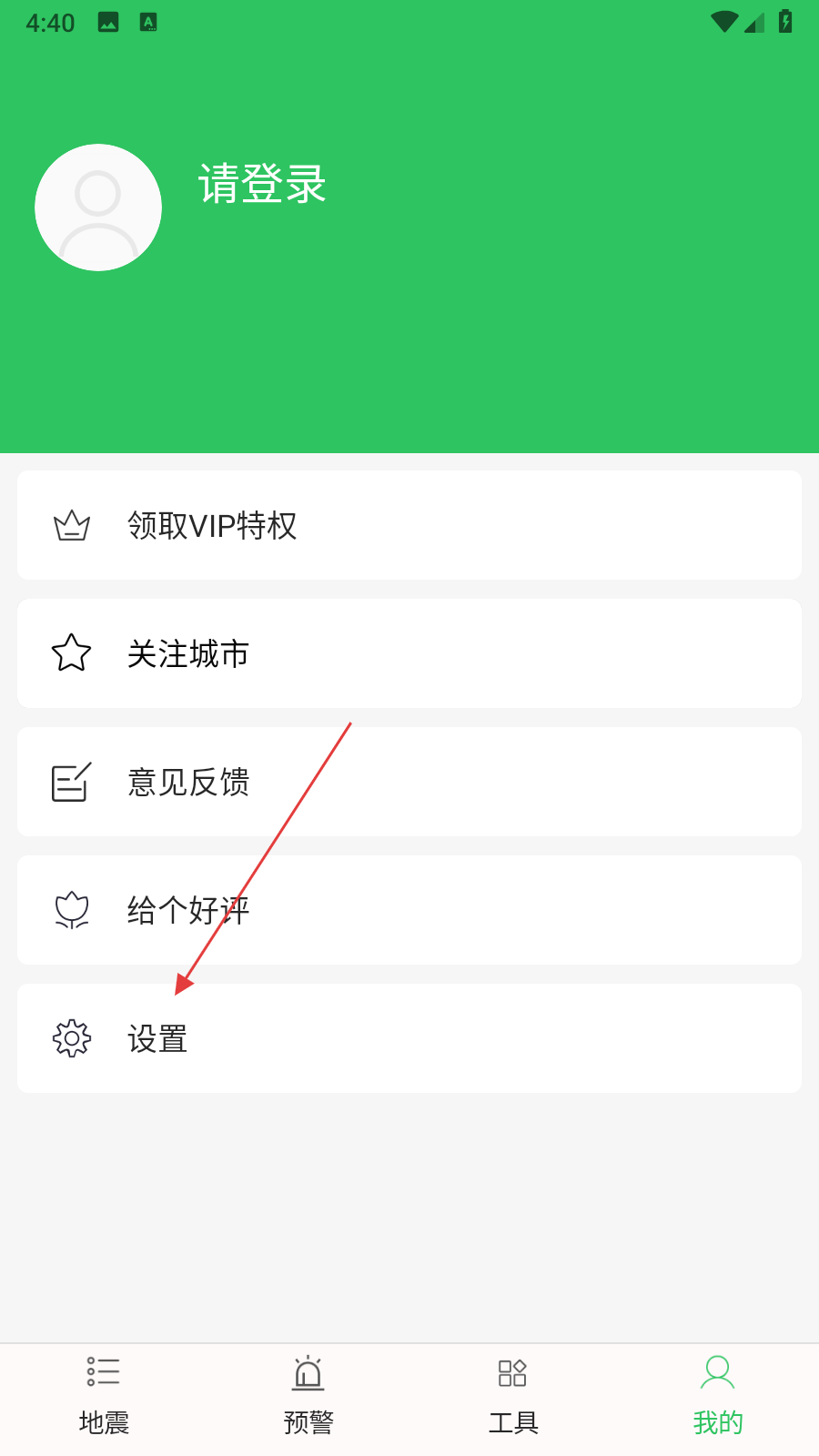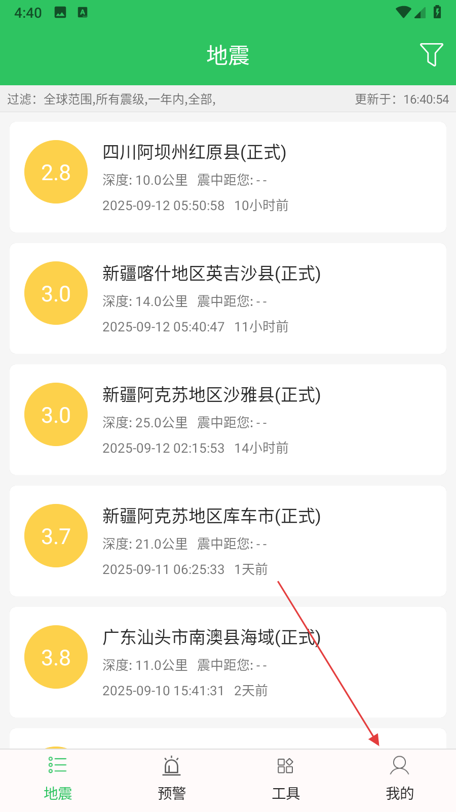 1、打开地震预警助手APP,点击页面右下角我的,进入个人中心页面。
