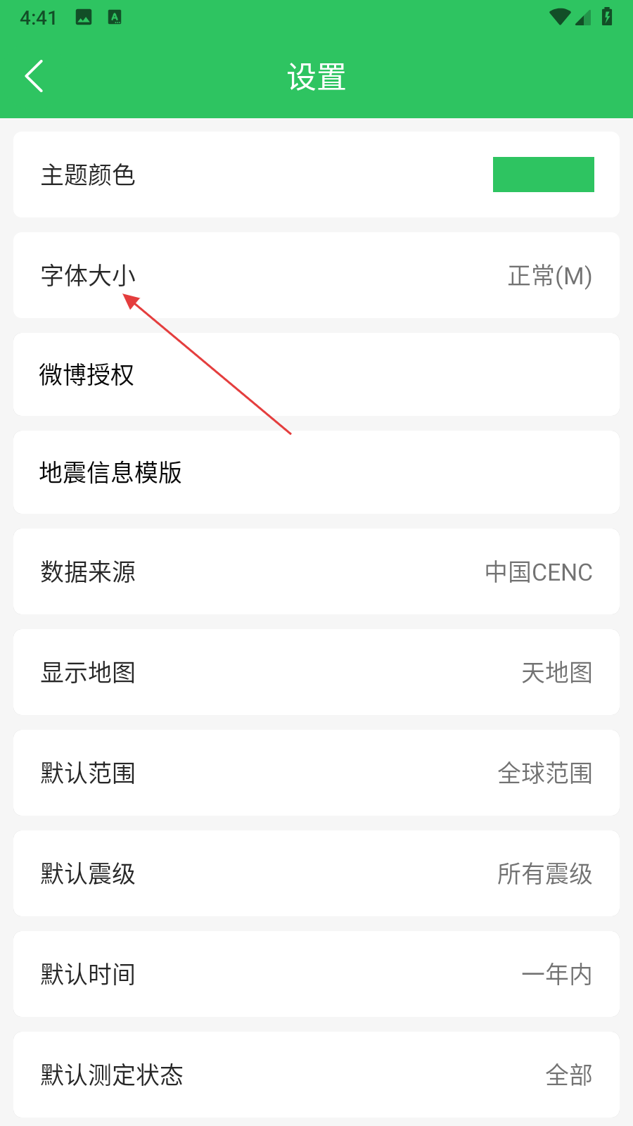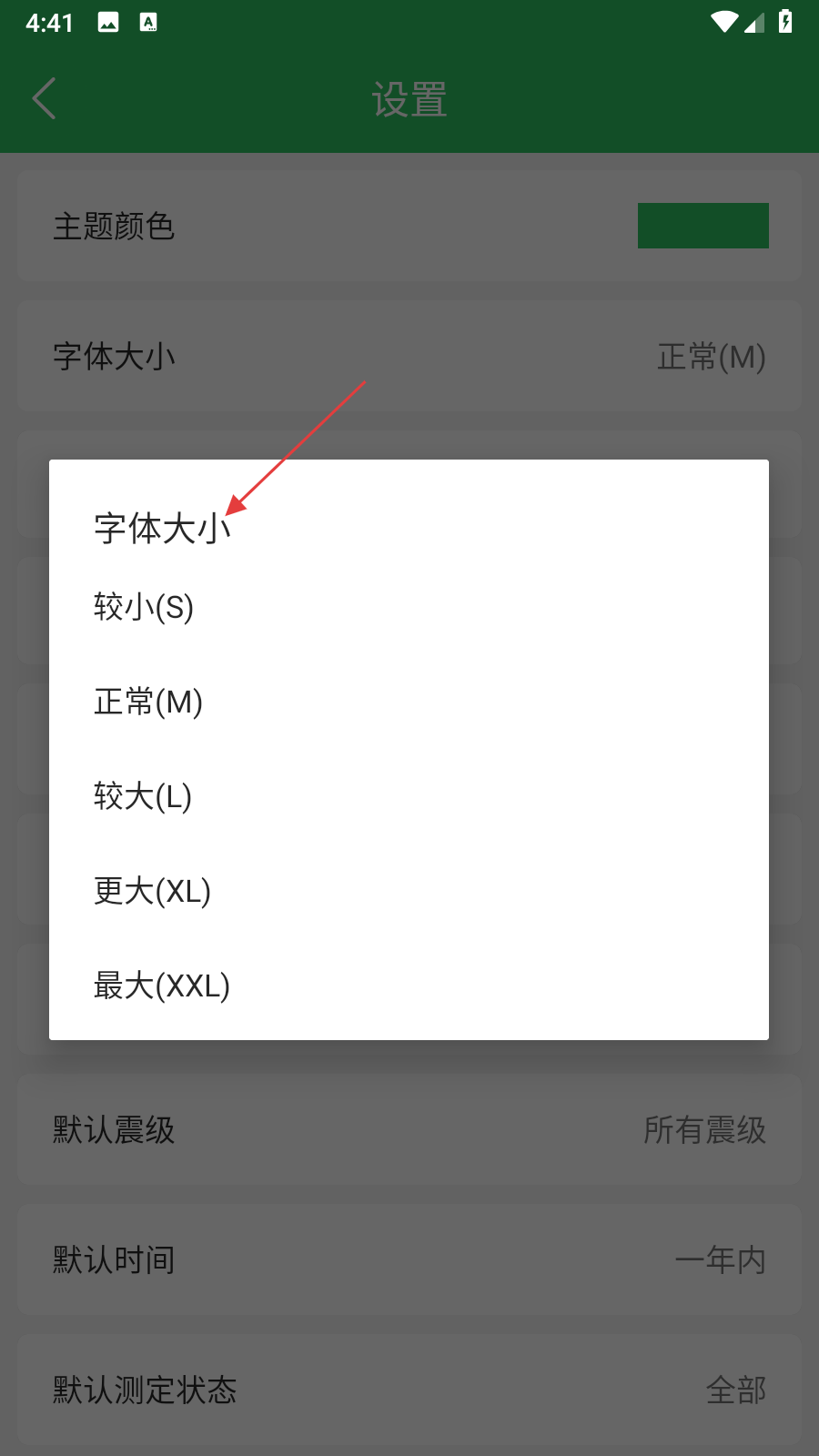 3、在设置界面中,点击字体大小选项,弹出字体大小选择框。
