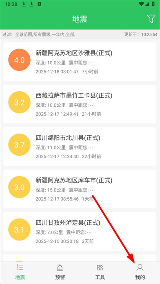 1、在地震预警助手应用界面,点击底部我的选项,进入个人页面。