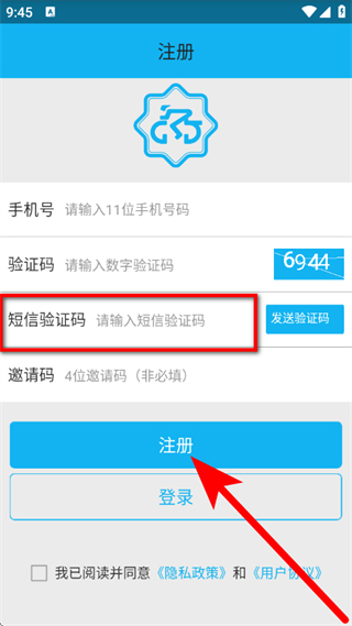 4、在输入框,输入短信验证码,勾选后,点击注册,完成账号注册。