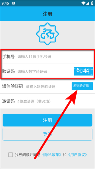 3、在注册页面,输入手机号码,点击发送验证码。