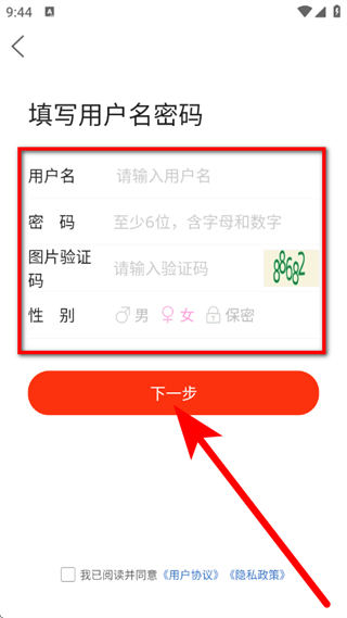 4、在填写用户名密码页面,输入用户名、密码并选择性别,点击下一步。
