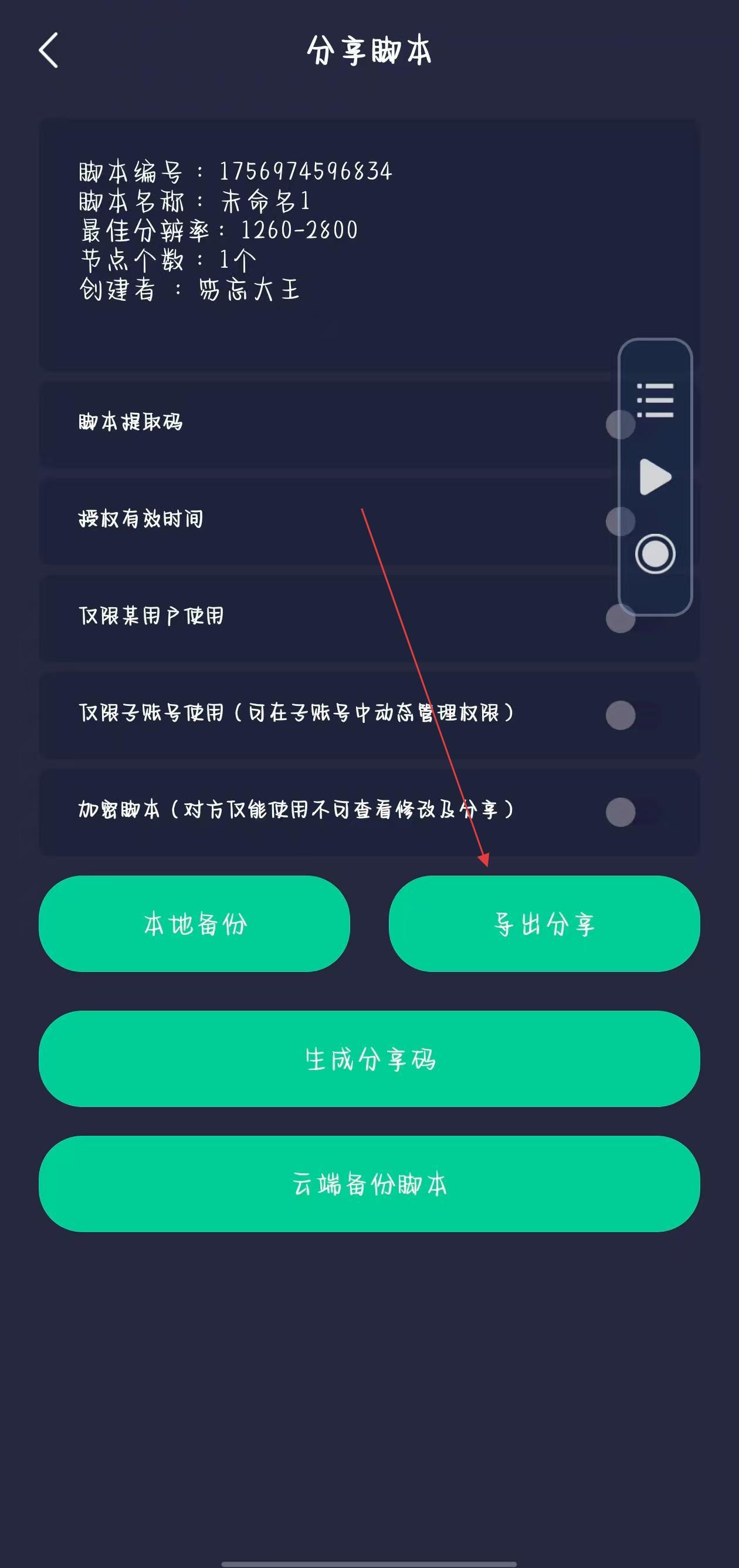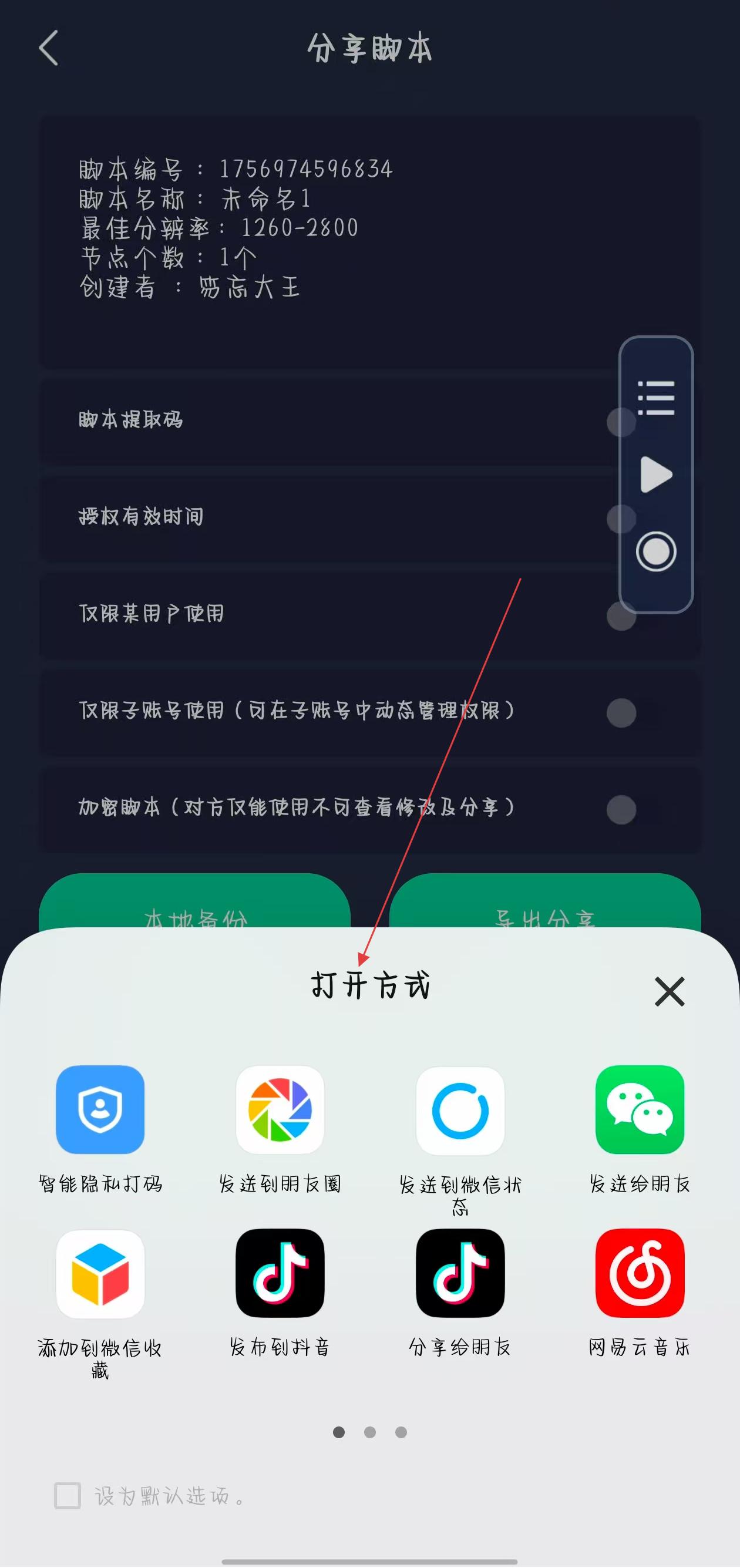 2、在分享脚本页面中,可选择导出分享,生成分享码或云端备份脚本等方式,若选择导出分享,点击该按钮后会弹出打开方式选择框。