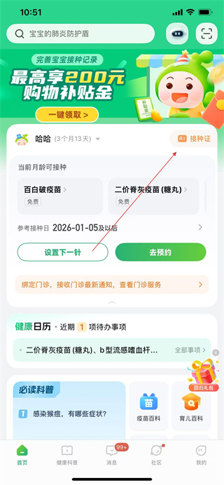 1、打开小豆苗app首页,点击右上角的接种证选项,进入接种证页面。