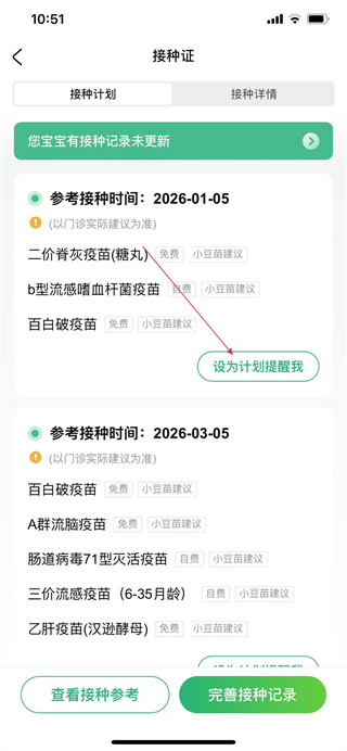 2、在接种证页面找到目标疫苗对应的设为计划提醒我,点击该按钮。