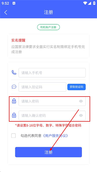 4、在注册页面,填写密码及确认密码,点击注册,完成账号注册流程。
