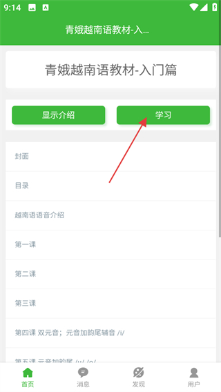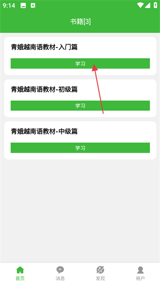 2、在书籍页面,选择青娥越南语教材入门篇对应的学习按钮进入详情页。