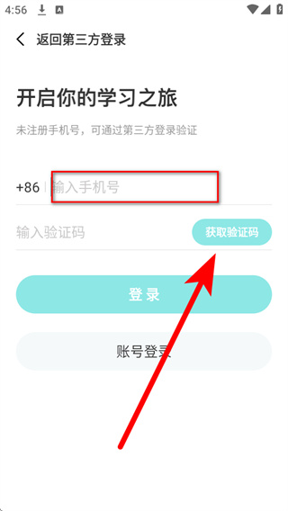 3、在登录页面,先在手机号框填写绑定的手机号,再点击获取验证码。