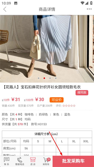 4、在商品详情页面,点击批发采购车按钮进入商品规格选择界面。