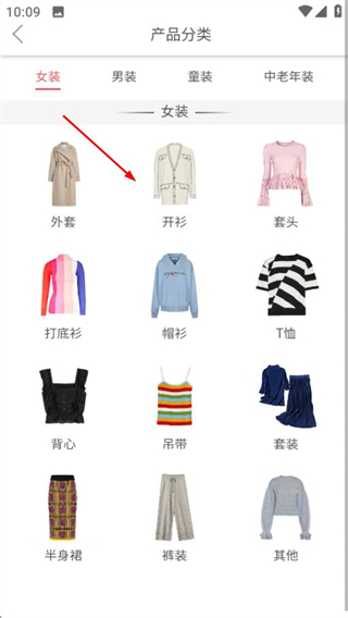 2、在产品分类页面,选择女装下的开衫分类进入开衫商品列表页。