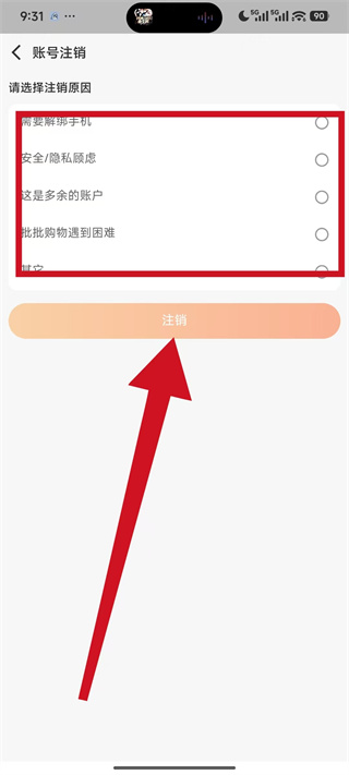 6、在注销原因选择页面,勾选一个注销原因,再点击注销,完成账号注销操作。