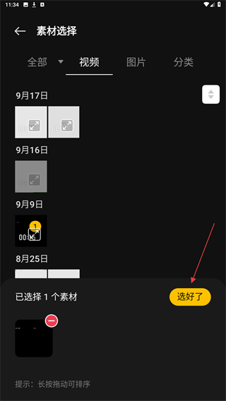 2、在素材选择界面选中目标视频素材,点击选好了,即可进入视频剪辑界面。