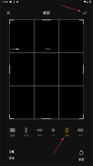 4、在裁剪面板中选择目标比例,调整画面范围后,点击右上角对勾按钮,完成裁剪。