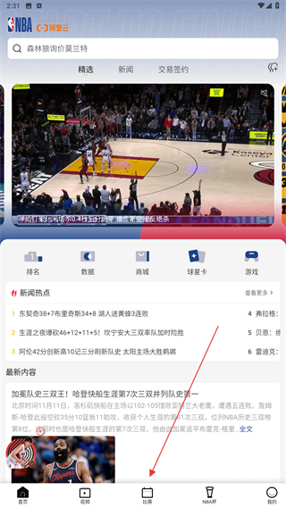 1、启动NBAAPP进入到首页内,点击导航栏中比赛的图标。