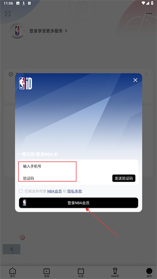 3、在登录弹窗中,输入手机号、验证码,点击登录NBA会员按钮即可完成。