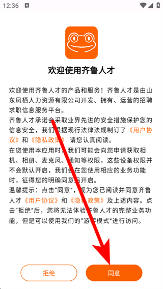 1、打开齐鲁人才招聘,在弹出提示框,点击同意,进入角色选择页面。