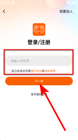 3、在登录注册页面,输入手机号,勾选后,点击下一步。