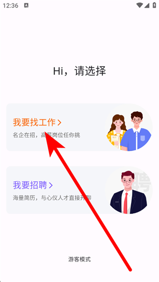 2、在角色选择页面,点击我要找工作,进入求职端的登录注册页面。