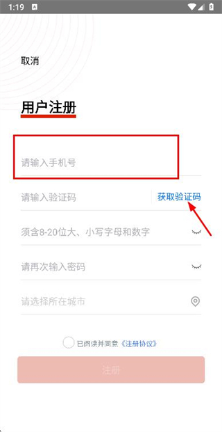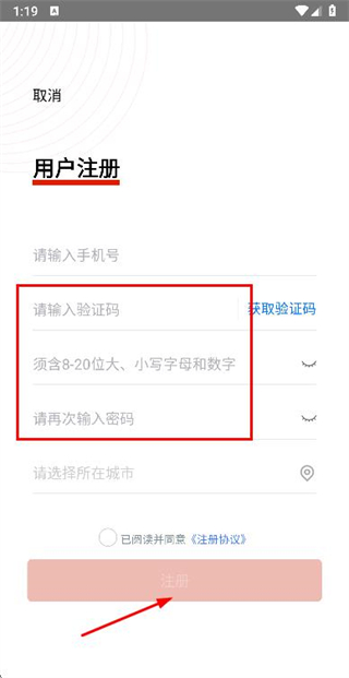 3、在注册账号页面填写验证码和密码,勾选协议后点击注册完成注册操作。