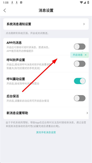 4、在消息设置界面,找到APP内消息对应的开关并点击开启,即可接收应用内的消息提醒。