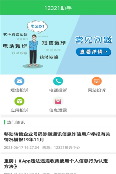 12321举报中心官方app是12321网络不良与垃圾信息举报受理中心官方推出的手机防诈骗软件,提供了诈骗电话、短信息等在线投诉服务,网友们可以直接在线举报收到的诈骗类数据信息。起到了全网人人监督、反诈作用,方便大家在线举报不良信息,投诉垃圾短信、诈骗电话等,实时反馈受理,处理结果一手掌握,操作简单又快捷,欢迎安装使用。