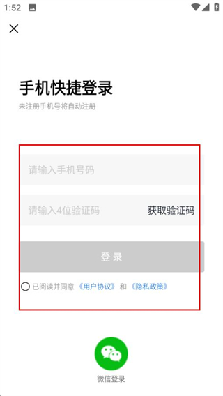 3、在手机快捷登录界面,填写信息并同意协议后点击登录按钮完成操作。