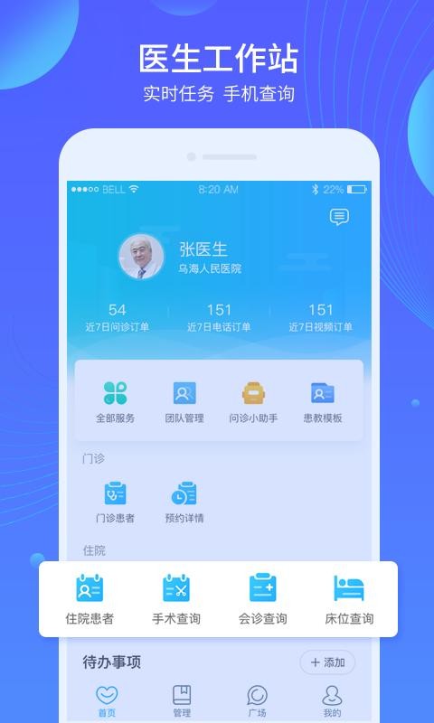乌海人民医院医生端是专门为医生提供线上就诊的平台,能够查看平台上面的患者信息,方便医生更好的进行病情的了解,能够直接在线进行患者问题的答疑解惑,还有一些医讯信息查看,非常的方便。