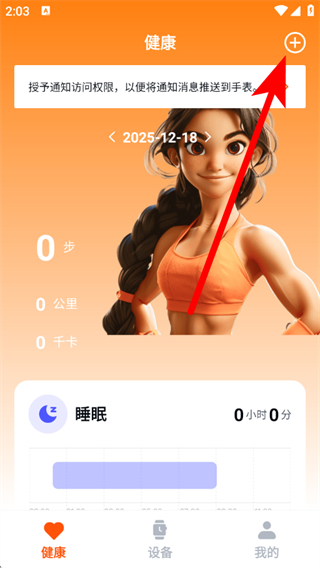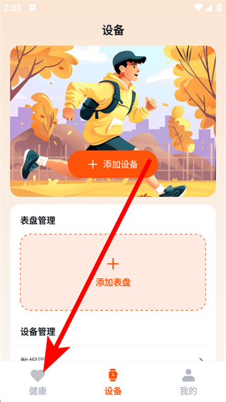1、进入设备页面,点击底部可切换健康,进入健康页面。