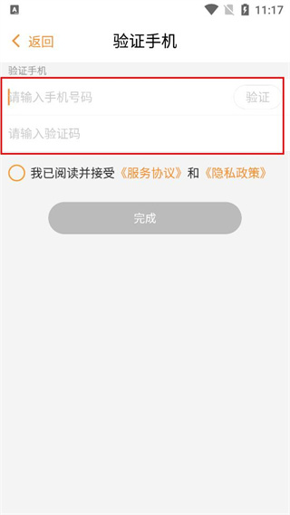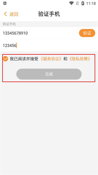 4、填写手机号码和收到的验证码,勾选相关协议选项,点击完成按钮结束验证。