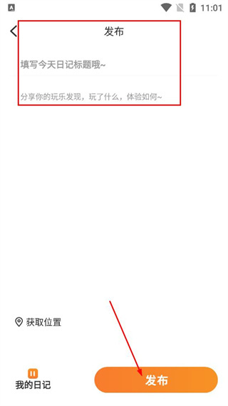 4、在发布页面,填写日记标题和对应的玩乐内容,完成后点击底部发布按钮,完成操作。